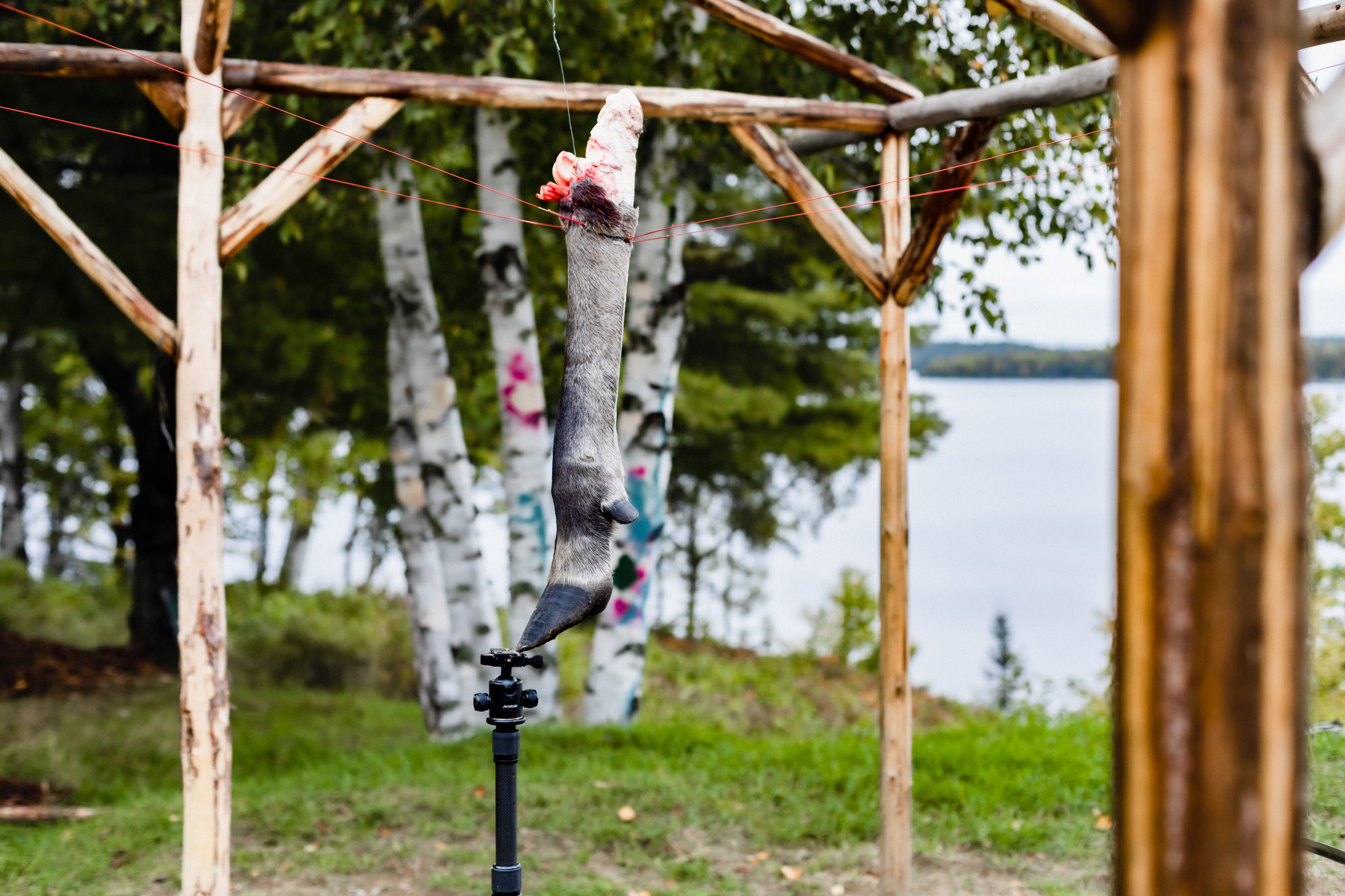 - Méthode expérimentale de captation par photogramétrie sur le terrain: Patte d'orignal suspendue à l’aide de cordelettes de parapente au centre d’une structure en bois et stabilisée à l’aide d’un trépied de caméra.