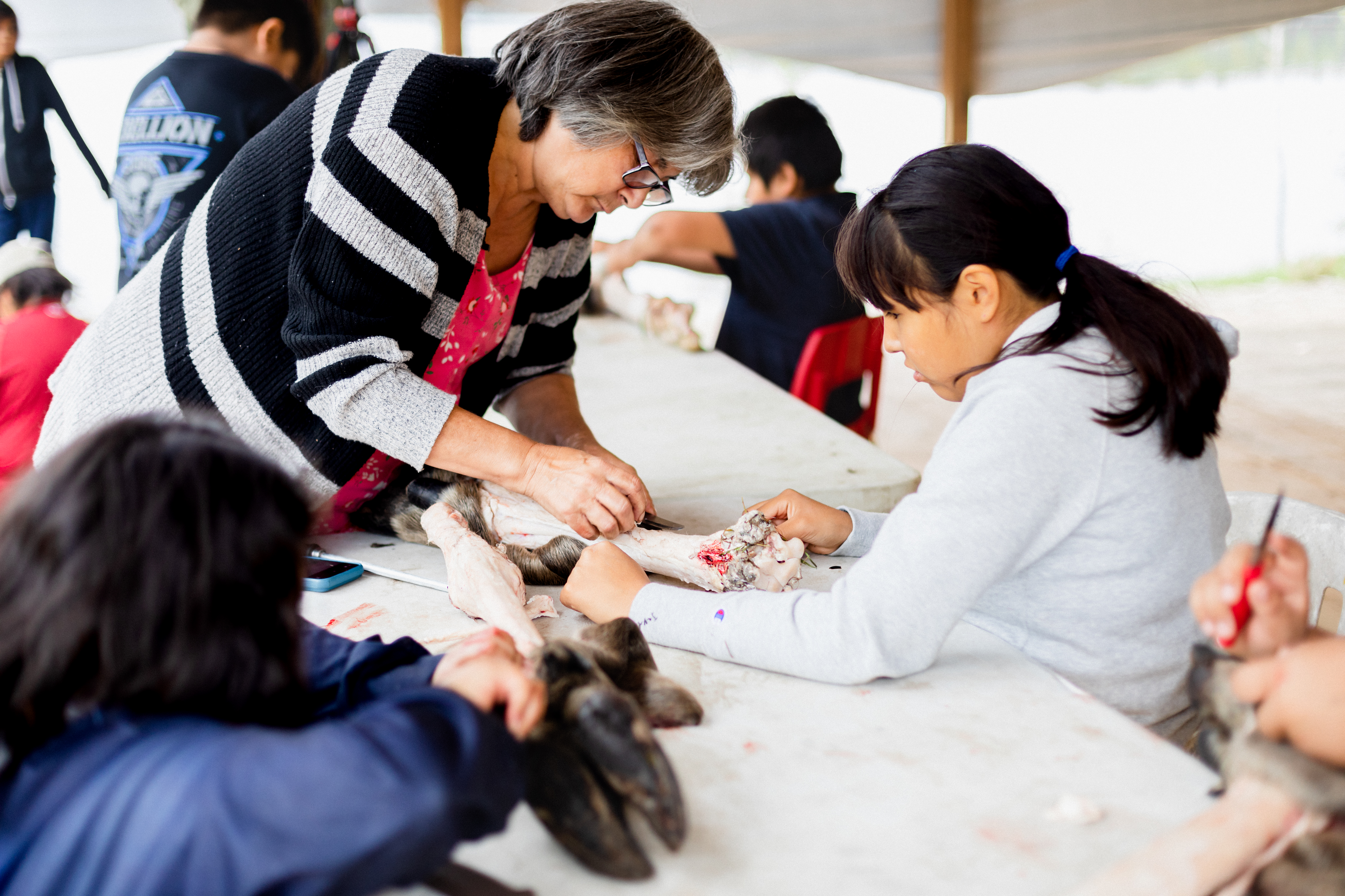 - Jayda (droite) retire la peau d’une patte d’orignal avec l’aide de Grace Ratt.