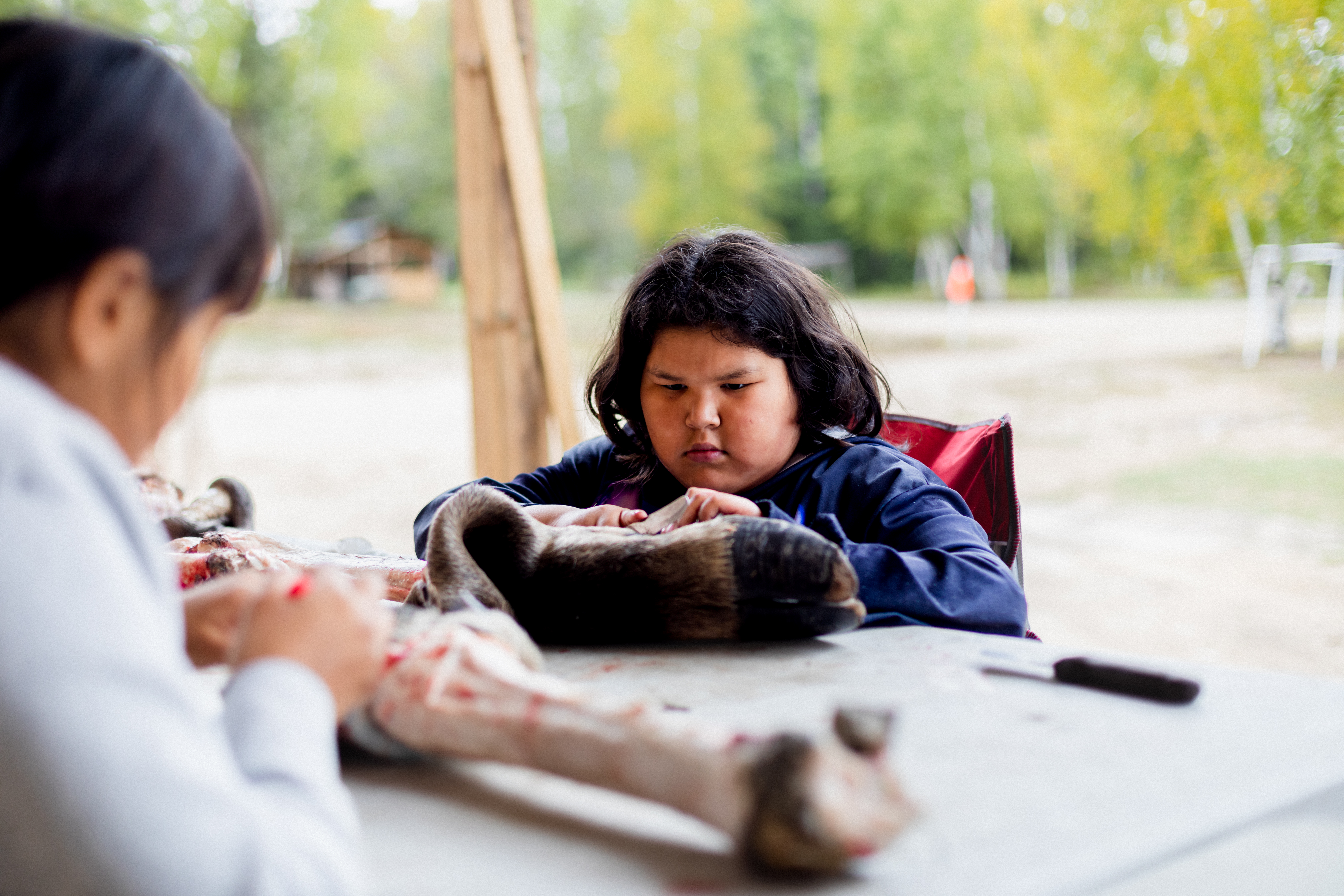 - Jayda (gauche) et Myley (droite) retirent la peau d’une patte d’orignal sous la supervision de Grace Ratt.