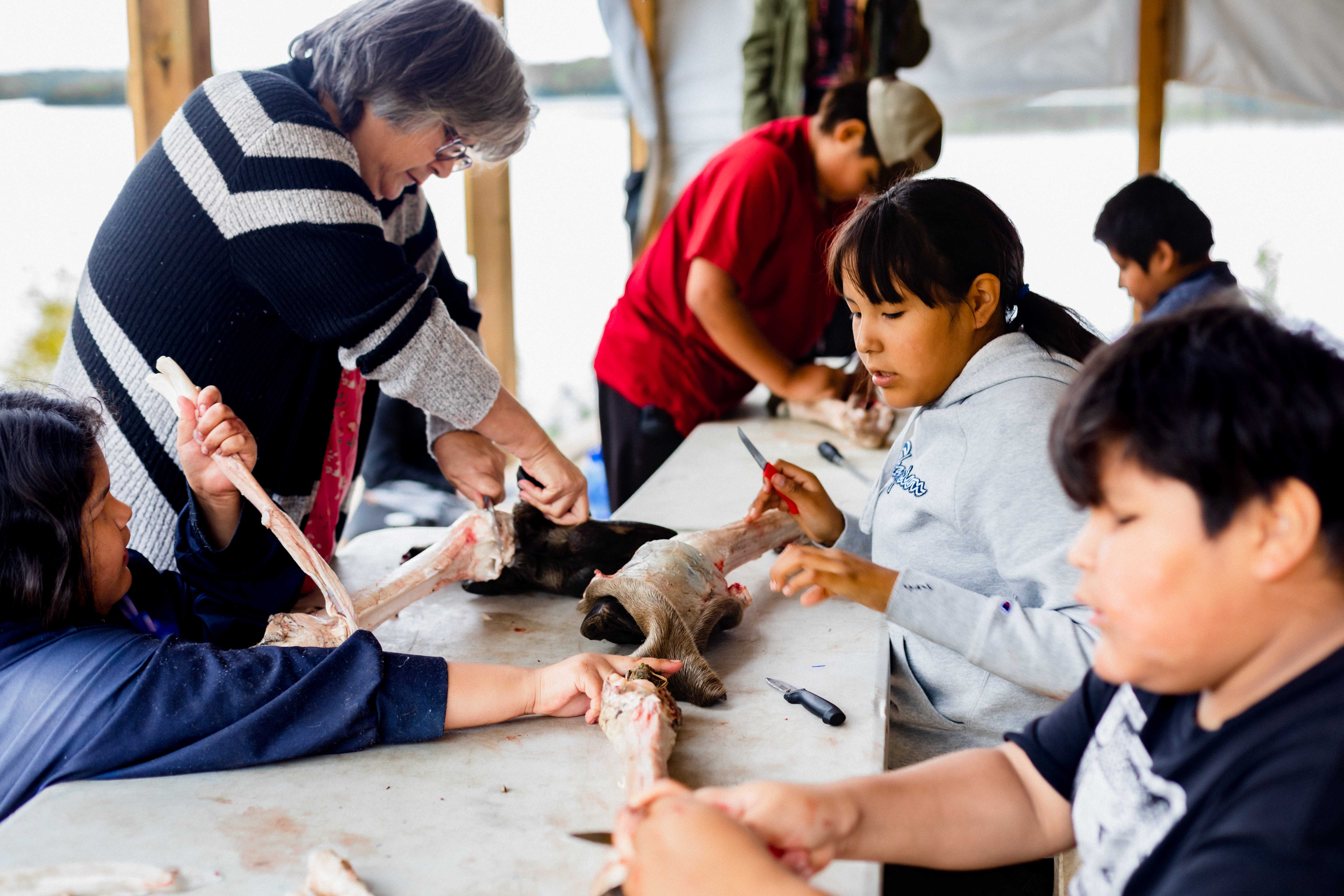 - Myley (gauche), Jayda (centre, droite) et Zander (droite) retirent la peau d’une patte d’orignal avec l’aide de Grace Ratt.