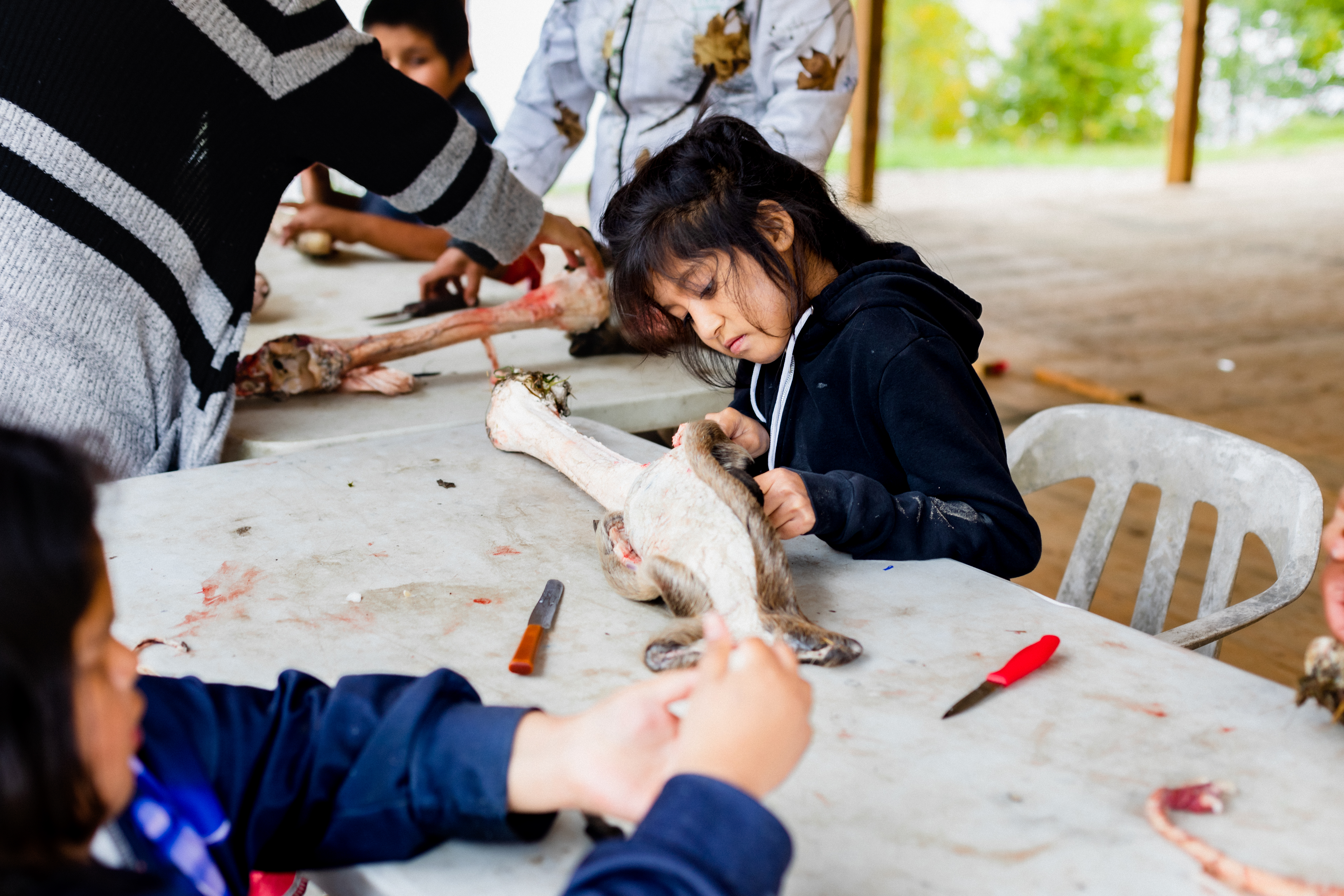 - Emily retire la peau d’une patte d’orignal sous la supervision de Grace Ratt.