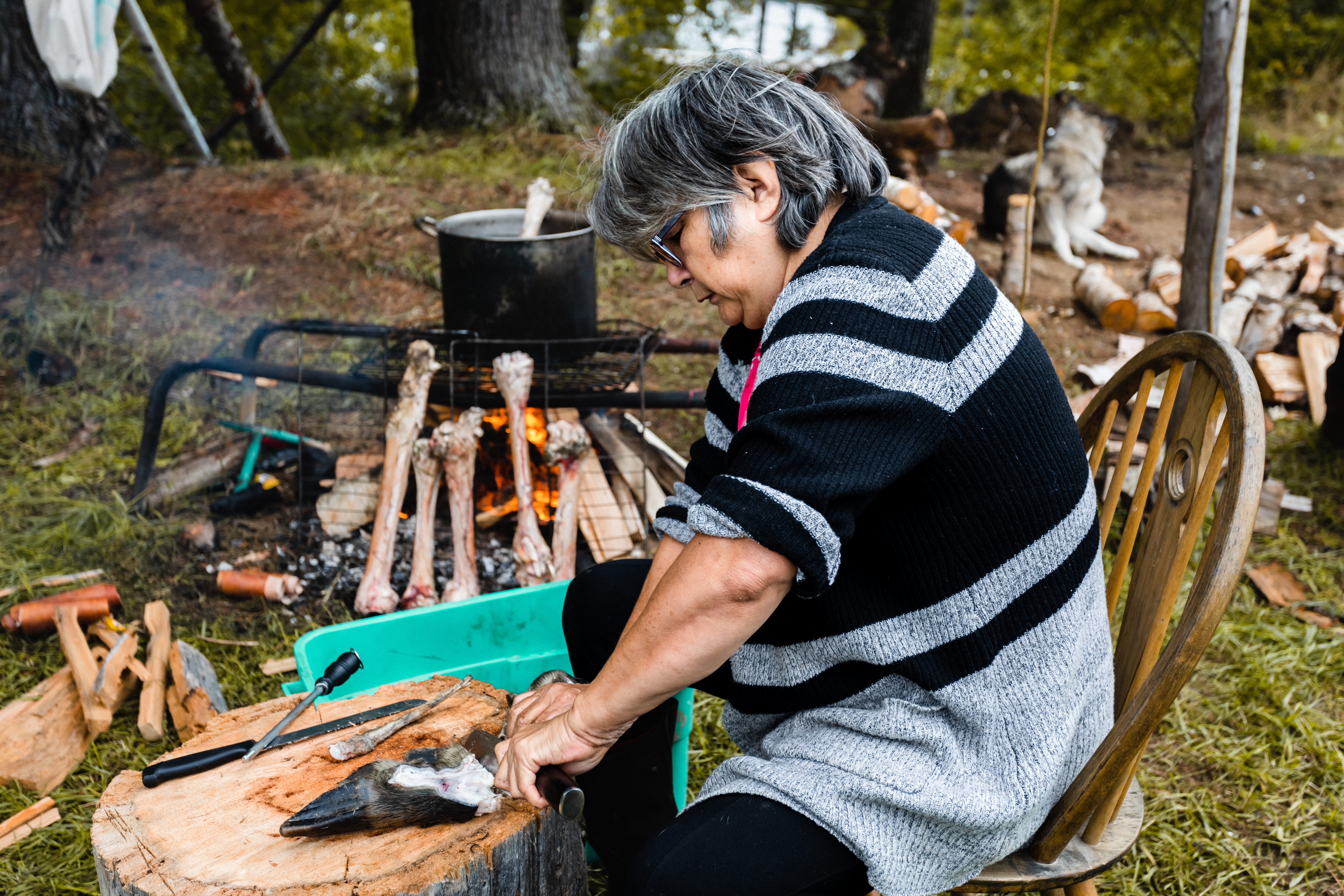 - Grace Ratt désosse une patte d’orignal pour les mettre à cuire au feu.