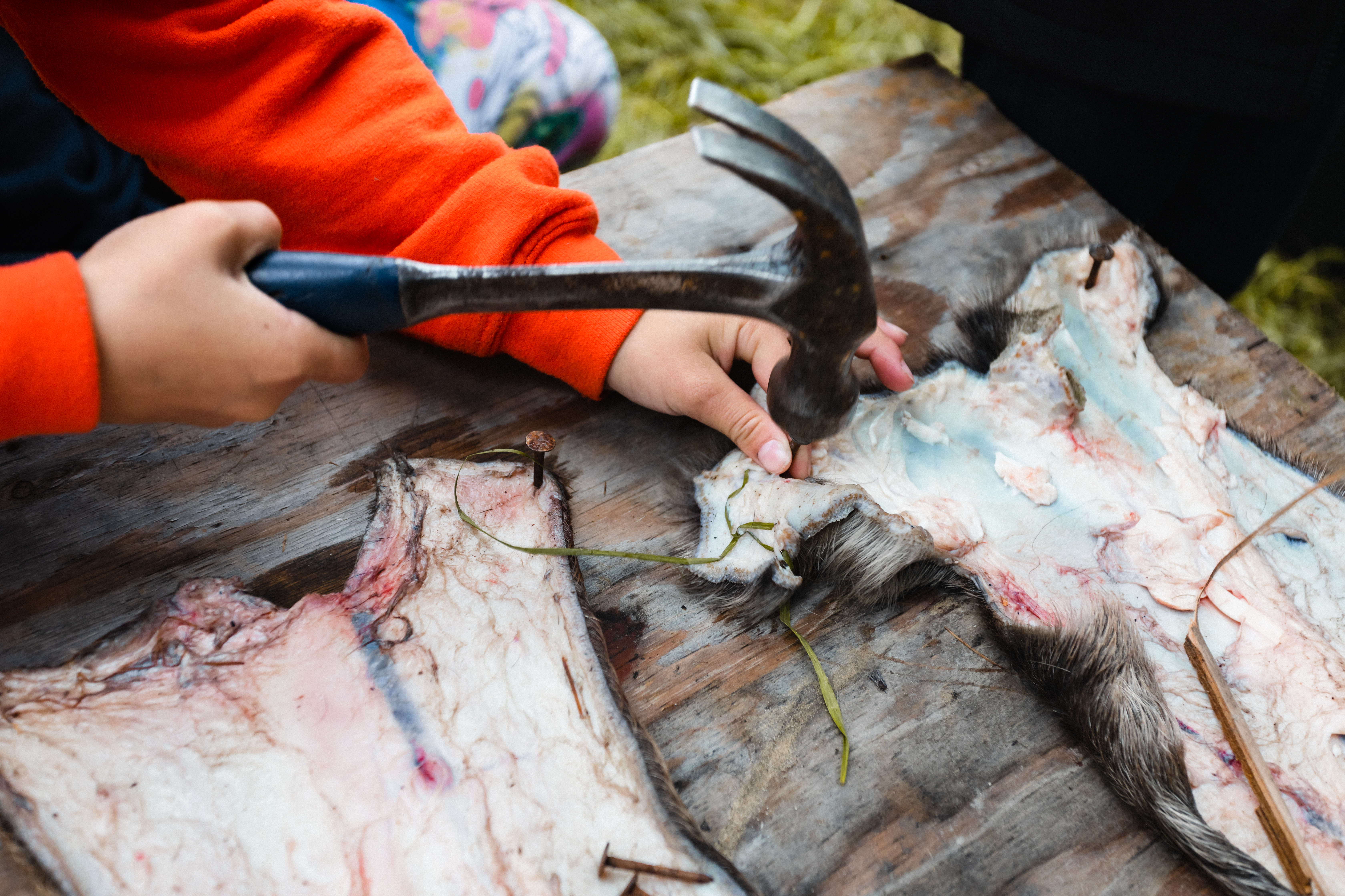 - Plan rapproché: Journey immobilise une peau de patte d’orignal à l’aide de clous sur une planche de bois.