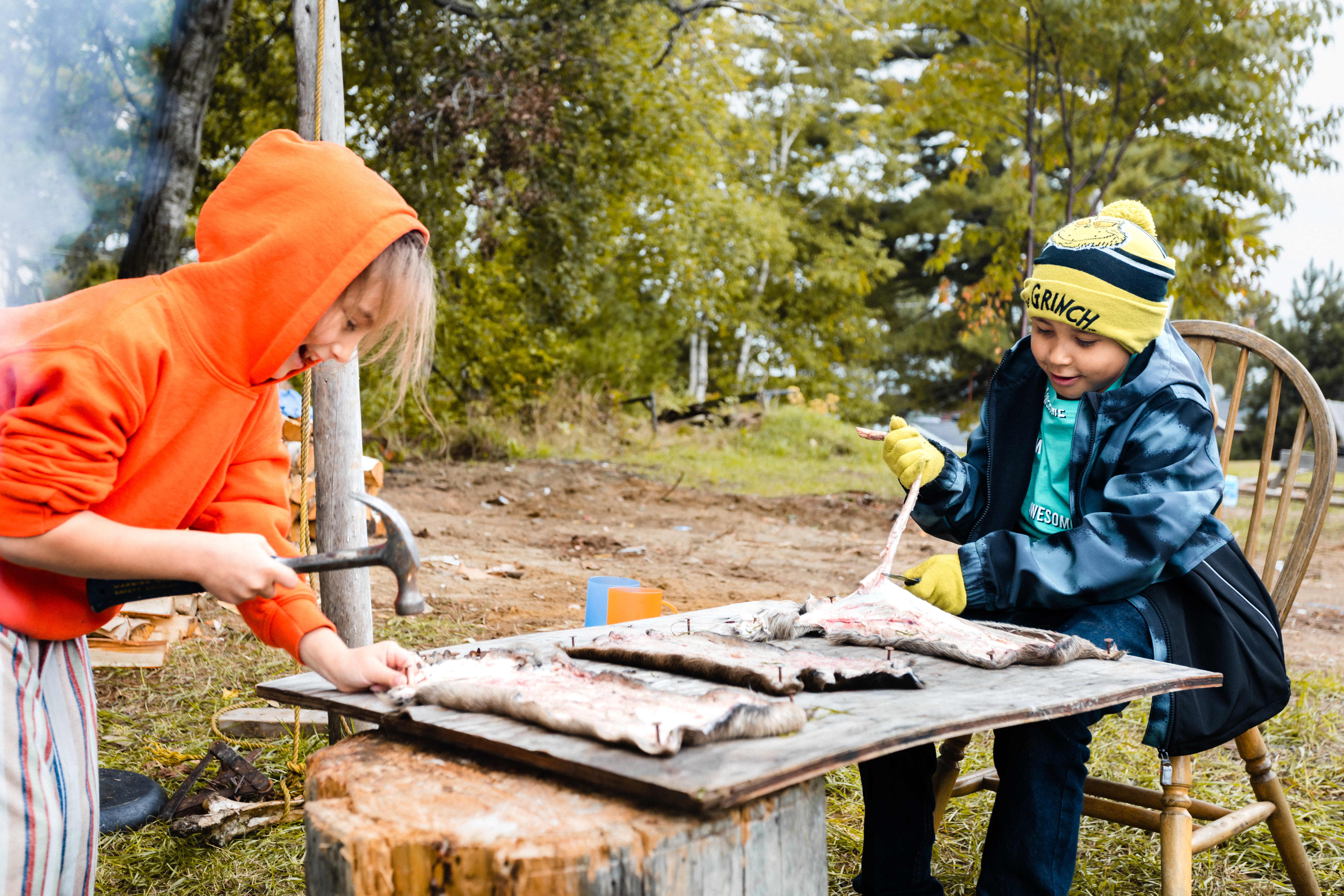 - Journey (gauche) immobilise une peau de patte d’orignal sur des planches de bois. Anthony (droite) nettoie une peau de patte d’orignal à l’aide d’un couteau.
